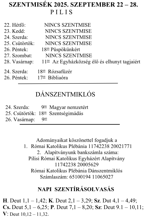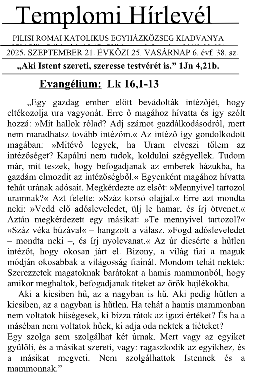 Templomi hírlevél – 2025.09.21 Szerző: Dóka Tamás Dátum: 2025.09.27. Kategória: Hírlevél Előző Templomi hírlevél – 2025.09.07 Következő Templomi hírlevél – 2025.09.28 Vélemény, hozzászólás? Válasz megszakításaAz e-mail címet nem tesszük közzé. A kötelező mezőket * karakterrel jelöltükHozzászólás * Név * E-mail cím * Honlap A nevem, e-mail címem, és weboldalcímem mentése a böngészőben a következő hozzászólásomhoz.